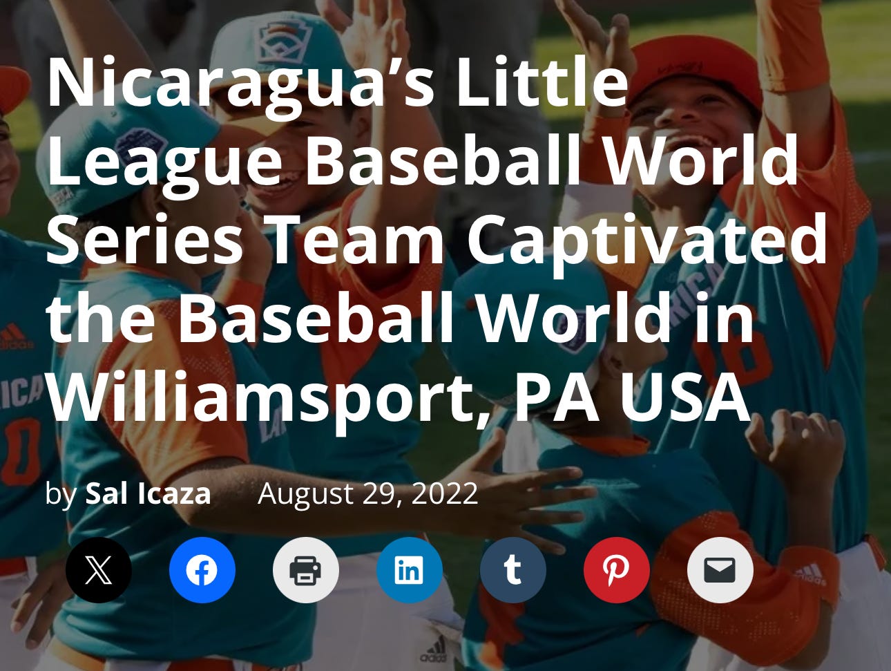 In Williamsport, PA from August 17-28, 2022 the Little League World Series took place after a two year absence due to Covid. Among the teams that came from around the world was ‘14th of September’, a team from Managua Nicaragua. This group of athletes had shocked the Little League of Central America by defeating the powerhouse teams of Venezuela, Honduras, and Costa Rica, as well as another impressive team from Nicaragua “A” Hermanos por Cristo. It had been 52 years since a team from Nicaragua had made it to the series. Immigration and visa issues allowed only one parent to travel per player. On the opening day of the series, August 17, they lost to Curacao 0-2. When the team got back to their dorm the coach and leaders of the team found the boys discouraged and weeping in disappointment. An official from the league came to explain, through a translator, that they would still be able to play again but that they would have to win from that point forward. Three days later, on August 20, they played their next game against another strong team- Puerto Rico but, unbeknownst to the team, their manager had put out a ‘bat signal’ (that is what they called it) to the American Nicaragua community that these boys needed support. They came - people unrelated to anyone on the team, some driving as much as six hours and others flying in from other states, simply wanting the team to see and hear their support. The team manager directed the boys to see and encouraged them to listen to this group of people who had come to cheer them on. In that moment something special happened.
